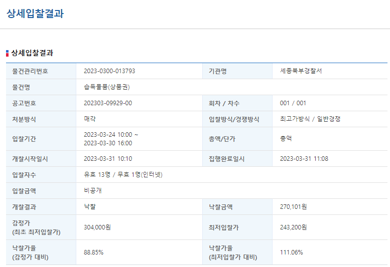 한가지 궁금했던 점은 보통 입찰금액이 공개되어 2등과의 금액차이를 확인 할 수 없는데 "비공개"로 되어 있더라구요.