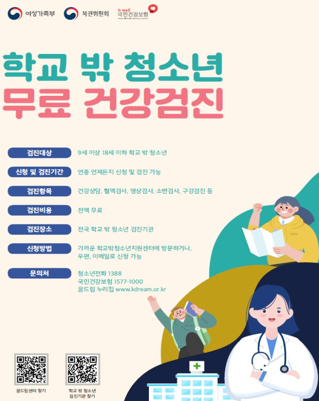 □ 여성가족부(장관 김현숙)는 ‘학교 밖 청소년 무료 건강검진’을 널리 알리기 위해 4월부터 석 달간 국민건강보험공단 및 전국 221개 학교밖청소년지원센터(이하 꿈드림센터)와 학교 밖 청소년 건강검진 집중 홍보 기간을 운영한다.