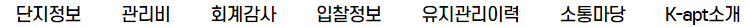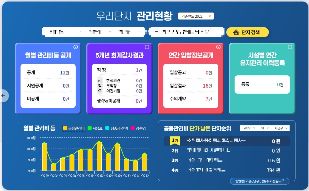K-APT의 다양한 정보 중 우리가 관심이 있는 건 '관리비' 항목이 될 것 같습니다. 메인 화면에 지역과 단지명을 설정하면 한 번에 보여주는 우리 단지 현황도 확인해 볼 수 있고, 가시적으로 뛰어난 사이트 인것 같습니다. 찾아보기도 편하고 비교하기도 편리하게 되어있습니다.