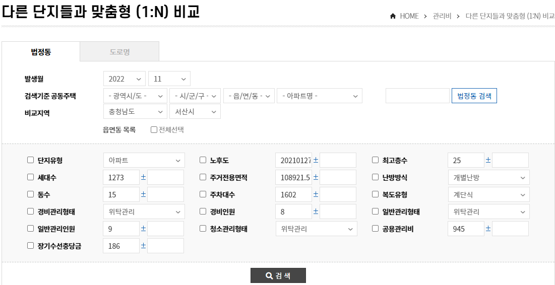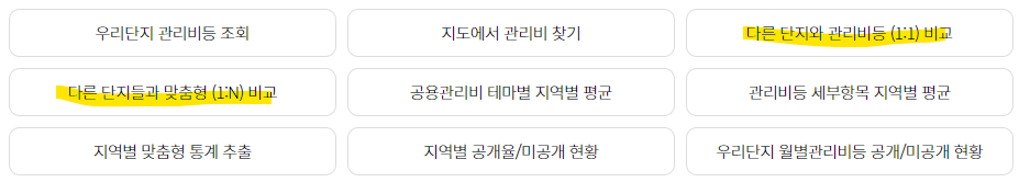 앞서 썼던 글에서 공동전기료에 대해서 설명하였는데, 그렇다면 우리 아파트는 다른 단지와 어떻게 다를까? 비교해 보고자 한다면 관리비 메뉴 하위에 '다른 단지와 관리비 등(1:1) 비교'와 '다른 단지들과 맞춤형 (1:N) 비교'로 확인할 수 있을 것 같습니다.