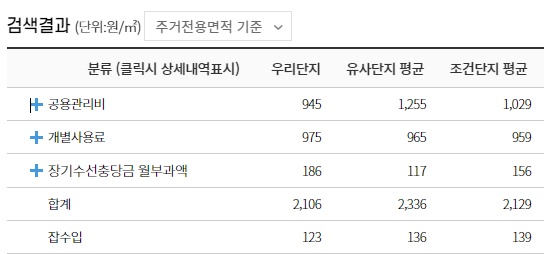 위와 같이 ㎡단위로 비교함을 볼 수 있는데, 이는 단지 상황이 모두 다르기 때문에 가장 효율적인 비교 방법인 것 같습니다. 일반적으로 단지의 크기가 클수록 "공용관리비"는 저렴해지는 편입니다. 공용관리비 부분은 얼마나 많은 세대가 나누어 내느냐에 따라 금액이 결정되는 부분 때문이지요. 모든 단지와 비교할 수 없는 부분이지만 대체적으로 단지 크기에 따라 큰 단지가 저렴한 편인 것 같습니다.